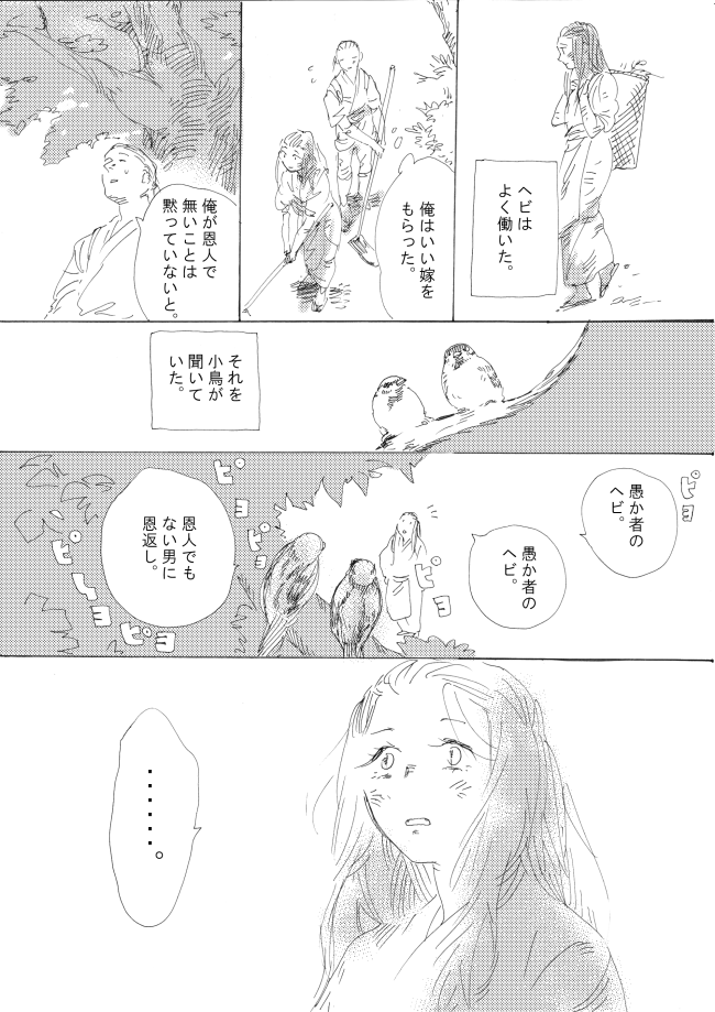 ヘビは人間と結婚したがっているかもしれない、という説には一定の説得力がある気がする。彼らはちょっと性癖が特殊そうだから。(個人の感想です。)『ヘビのお嫁さん』 pic.twitter.com/98OvKVkt0v