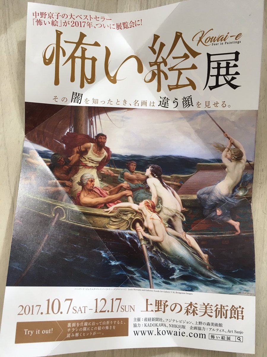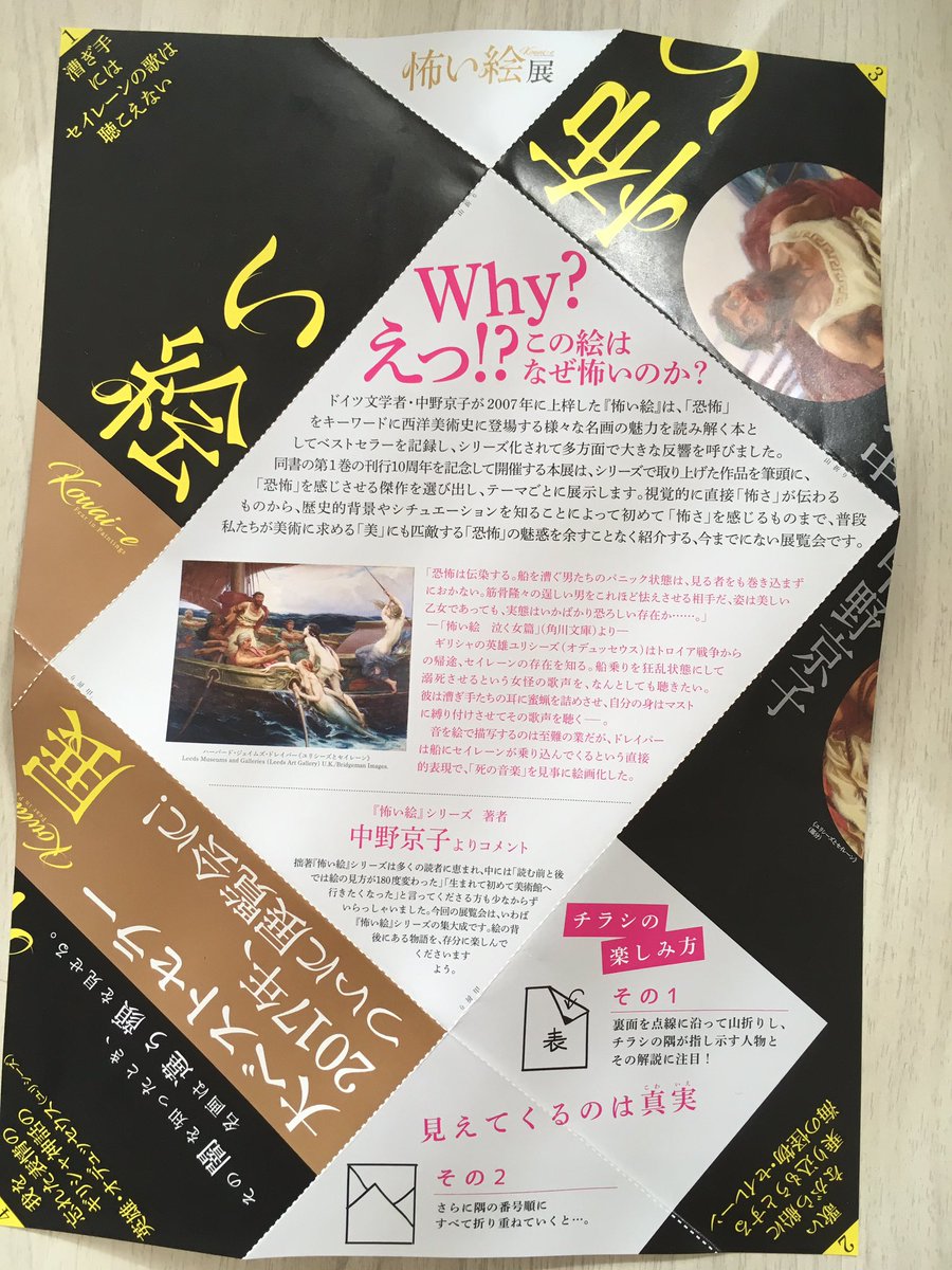 こないだもらってきたチラシがすごい。表だけ見ると普通のチラシだけど、裏面の点線に沿って折り返すと、裏面の隅に書かれた人物解説が表の絵のその人物をぴったり指し示すようになってる。さらに、四隅に振られた番号順に折り返すと、ひとまわり小さなチラシが完成する。 pic.twitter.com/UtQPSRGkr2